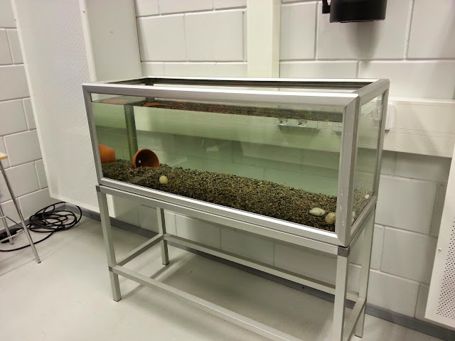 | Kerholaiset pesivät kivimursketta akvaarion pohjalle. Labratilassa on odottamassa kala-asukkaita 200 litran tankki. |