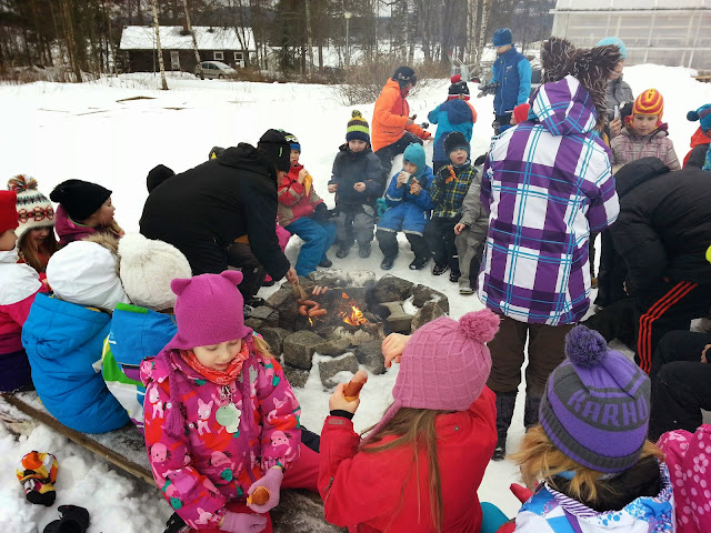 | Lapset Vertistä ja Jälkkäristä nauttivat tänään välipalansa nuotiolla. |